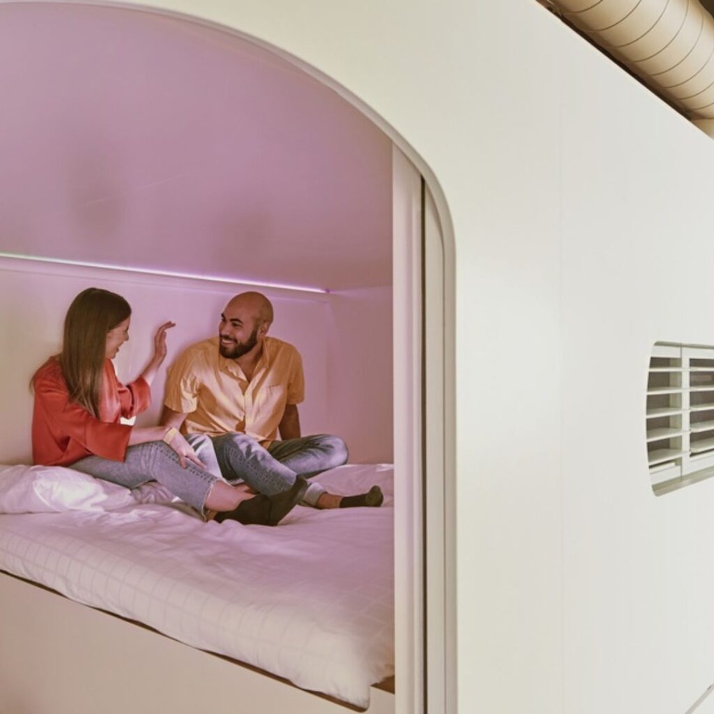 Opened in 2020, the Copenhagen outpost marked the brand’s first location outside the Netherlands, following successful launches in Amsterdam and Rotterdam. It features private sleeping ‘Hubs’ – compact, soundproof pods with mood lighting, streaming capabilities, and all the essentials for a recharging stay. Guests also get access to self-service F&B, communal hangout areas, and a sauna – plus digital wristbands that function as both room keys and payment cards.