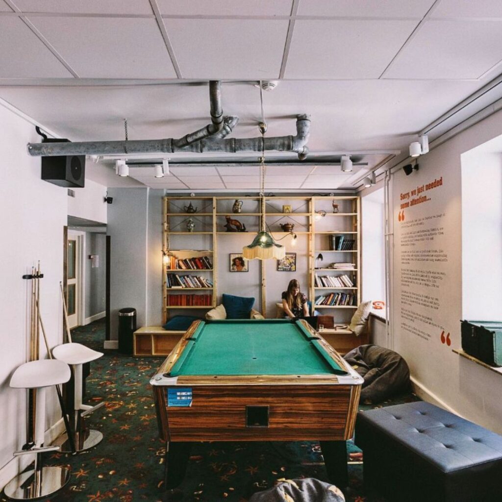 Set inside a former union building, the property blends industrial interiors with functional design. Accommodation ranges from private doubles to shared dorms and offers communal facilities including a gym, self-service kitchen, cinema, café-bar and indoor pool. Coworking space is also available, adding value for remote workers and longer-stay guests.